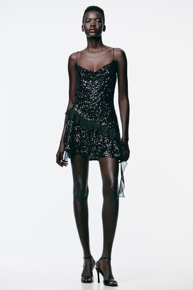 Siyah payetli ve nakış detaylı, ince askılı ve straplez yaka kısa mini elbise, romantik buluşmalar için uygun. ✨