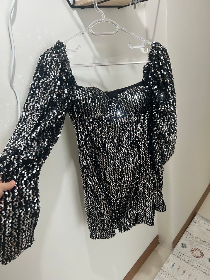 Uzun kollu, kayık yaka, bol kesim siyah mini abiye elbise. Payetlerle kaplı ve yılan desenli, parti için uygun. ✨