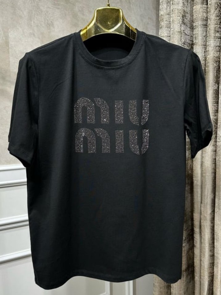 Siyah, kısa kollu ve yuvarlak yakalı kadın tişörtü. Payetli "miu miu" baskılı, sentetik kumaştan, bol kesimdir.