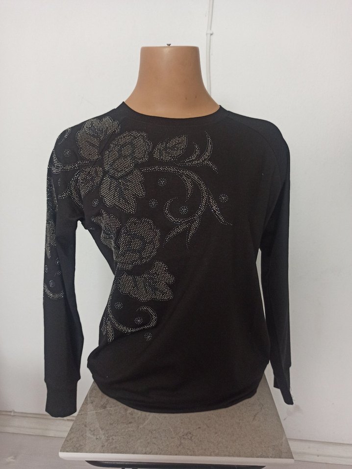 Siyah, uzun kollu ve yuvarlak yakalı bu bol kesim kadın bluz, payetli çiçek nakışı ile süslenmiştir. Sentetik kumaştan yapılmış, günlük kullanıma uygundur. sıfır ürün hiç kullanılmadı aynı gün kargoya verilir