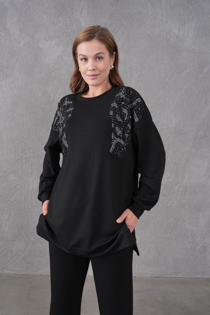 Siyah renk, siyah uzun kollu, yuvarlak yaka, bol kesim kadın alt üst takım tunik Omuzlarda payetli nakış detayları bulunur, oysho kumaştan üretilmiştir, günlük kullanım için uygundur. ✨