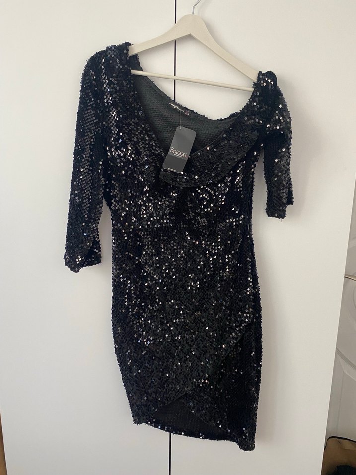simli detaylı, siyah mini elbise. Askılı kollar cesur ve gotik bir hava katıyor, romantik akşamlar için ideal. ✨