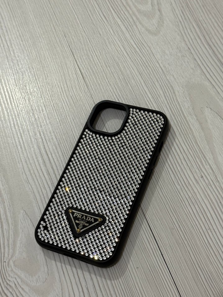 Sokak stilinde, gri payetlerle süslenmiş siyah telefon kılıfı, Prada logosu ile detaylandırılmıştır.