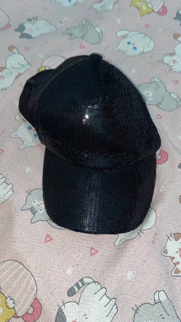 Siyah payetli, sentetik kumaştan yapılmış, sokak stiline uygun, gösterişli ve avant-garde tasarımlı kadın şapkası.
