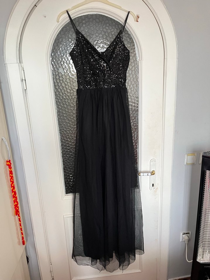 Siyah renkte, straplez ve drapeli detaylara sahip uzun abiye elbise, ince askılar ve vücuda oturan kesimiyle şık bir görünüm sunar.
