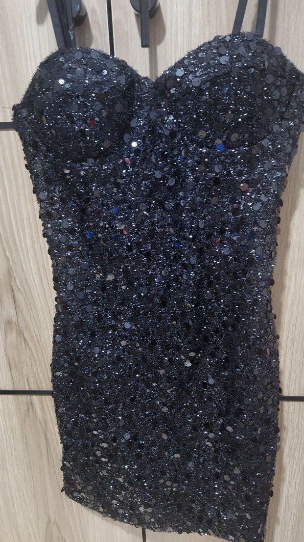 Siyah payetlerle kaplı, straplez ve kısa kesim abiye elbise, fit kesimiyle göz alıcı ve desenli gotik tarz sunar. ✨Model ölçüsü boy 157 kilo 57