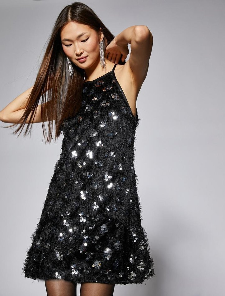 Siyah, straplez, payetli ve işlemeli desenli bu dar kesim kokteyl elbise, cesur parti görünümleri için uygundur. ✨