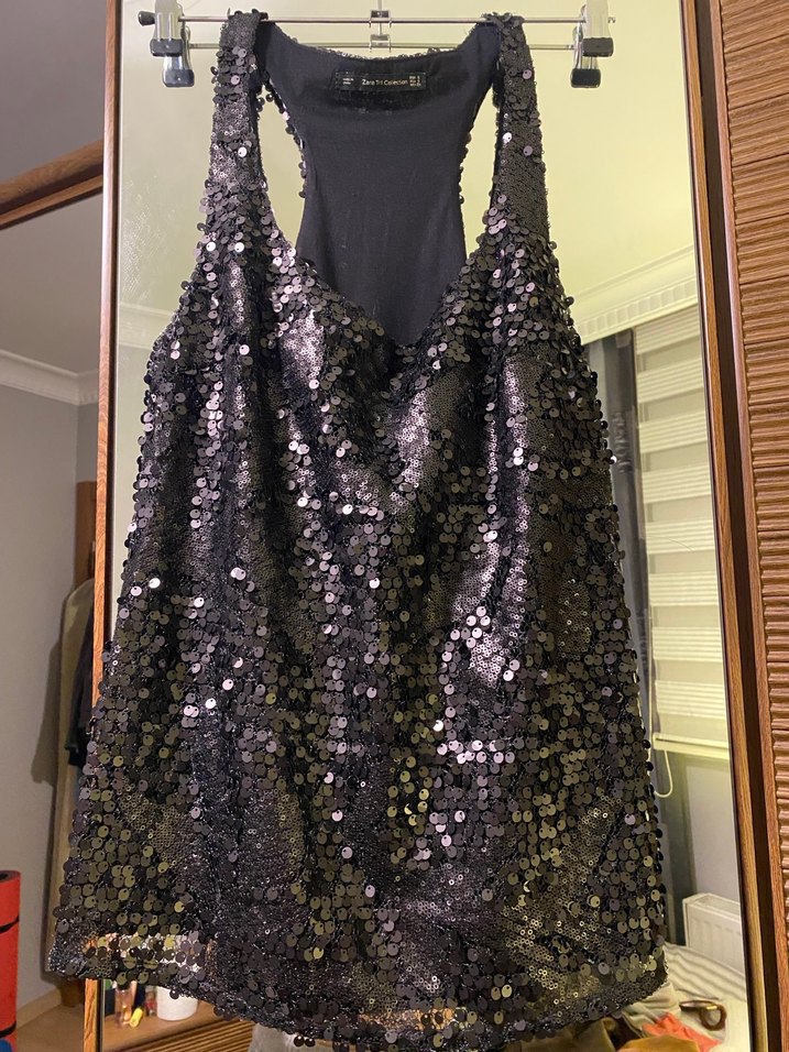 Siyah, straplez yaka ve kolsuz tasarıma sahip, payetlerle süslenmiş dar kesim midi elbise. ✨