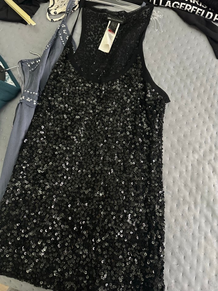 Siyah, straplez, payetli ve vücuda oturan bu gece elbisesi, midi boyda ve kolsuzdur. Parti için uygundur. ✨