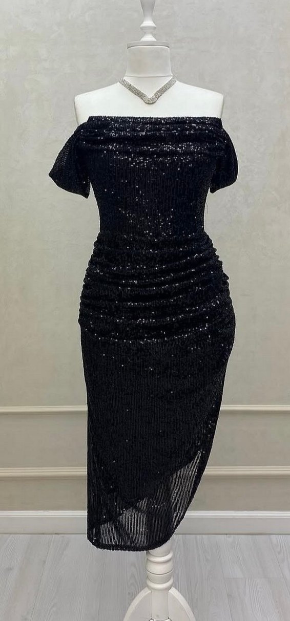 Boy:65-105 1 kez giyildi. Siyah payetli parlak şık elbise. Asimetrik kesim, straplez yaka, kendinden göğüs pedli, şeffaf askılı elbise.