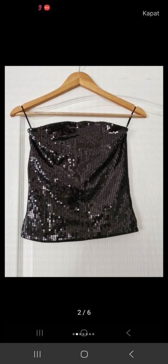 Siyah, straplez, kısa ve payetli sentetik kumaştan yapılmış dar kesim mini büstiyer, partiler için uygundur. ✨