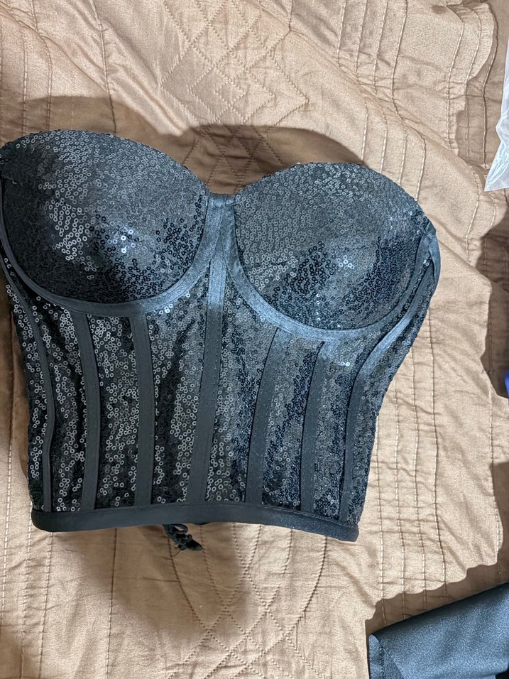 Siyah renkli, straplez ve askılı kısa büstiyer. Payetli ve nakış detaylarıyla dikkat çeker, gece partileri için uygundur.✨