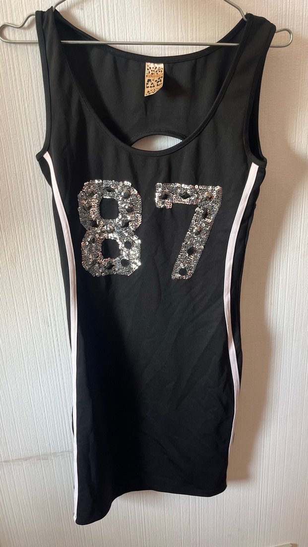Siyah, straplez, kolsuz, vücuda oturan midi elbise, payetli '87' baskıya sahip. Sentetik kumaştan, spor ve sokak stili için uygun.