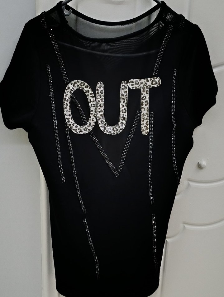 Siyah, payetli ve baskılı "OUT" yazılı, kısa kollu, yuvarlak yaka, bol kesim tişört Sentetik kumaştan, dış mekan kullanımı için uygundur. boy 67 iki kol arası 47cm