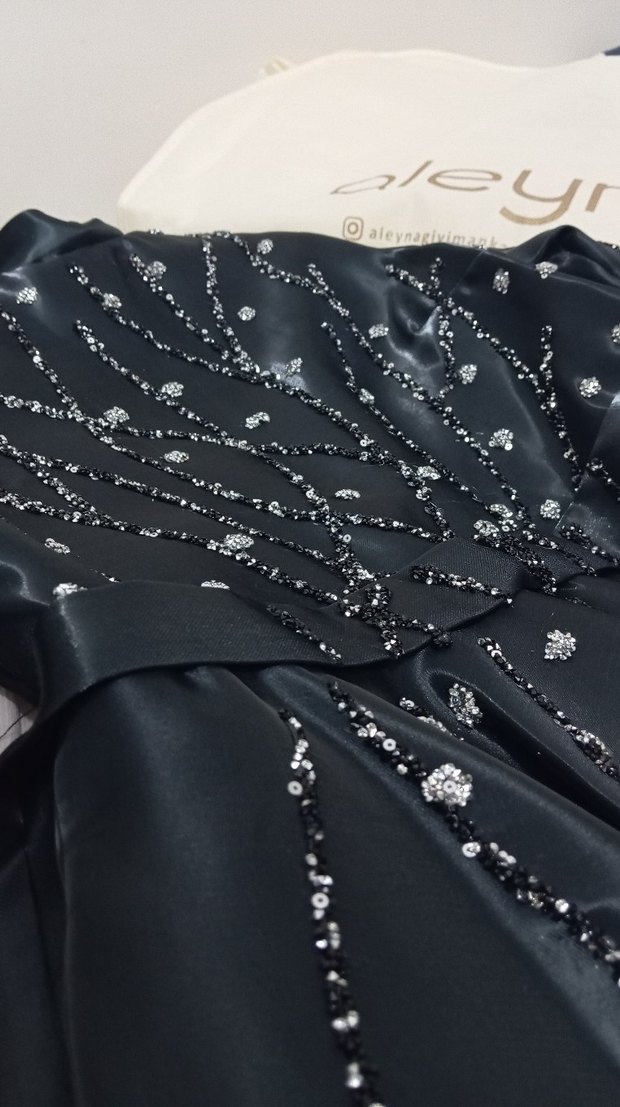 Siyah, uzun boy, tekne yaka ve askılı kollu abiye elbise. İşlemeli ve payetli detaylarıyla dikkat çeker. Düzenli kesim ve parlak görünüme sahiptir. Yeni aldım bedeni olmadı onun için satıyorum.