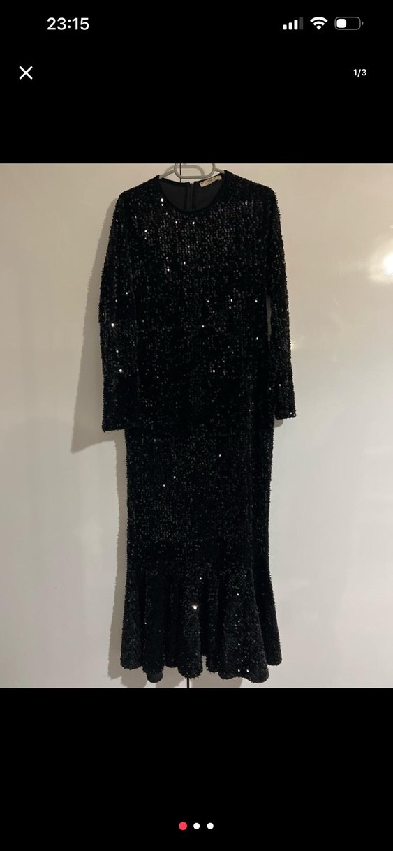 Siyah payetli uzun kollu abiye elbise, regular fit kesimli ve desenli. Gösterişli parti davetleri için uygundur. ✨
