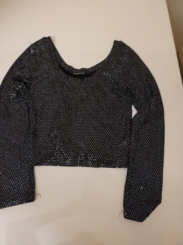 Siyah payetli bluz, uzun kollu ve teknesi yaka detaylıdır. Normal midi uzunluğunda, sentetik kumaştan yapılmıştır ve partiler için uygundur. ✨