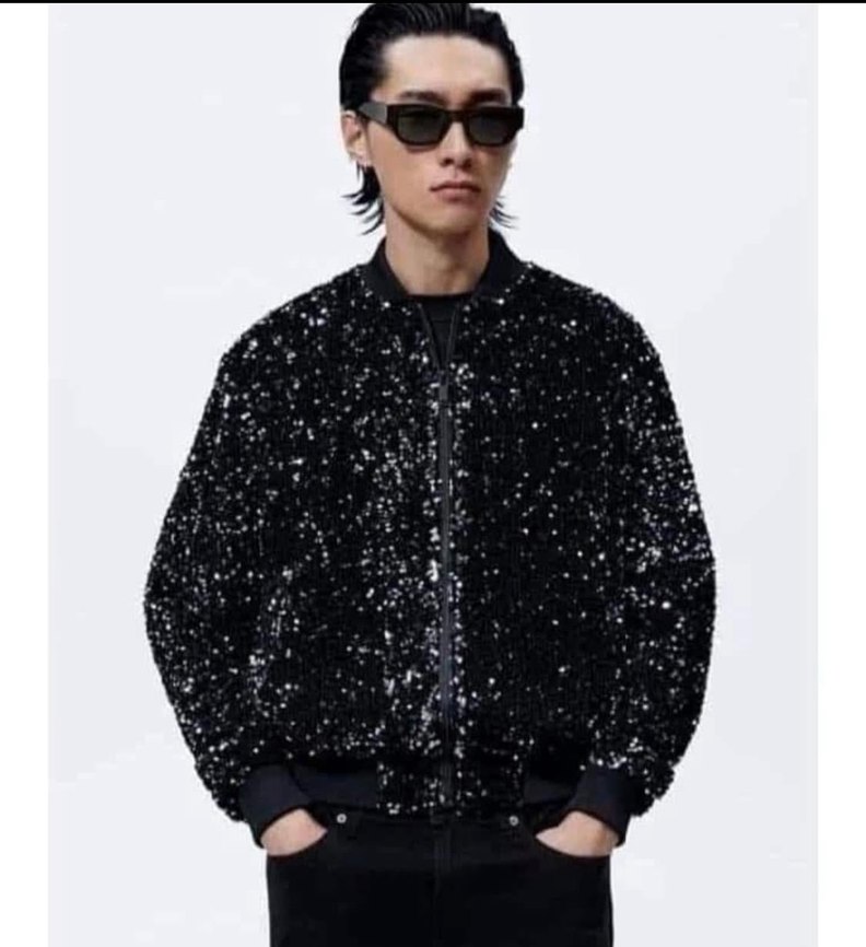 Siyah, payetli ve bol kesim erkekceket, uzun kollu ve yuvarlak yakalıdır. Sentetik kumaştan üretilmiş olup parti için uygundur. ✨