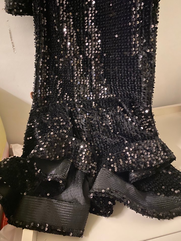 Siyah, payetli, uzun kollu, bisiklet yaka ve vücuda oturan kesimiyle dikkat çeken uzun abiye elbise, partiler için uygundur. ✨ 1 Kere düğünde giyindim başkada giyilmedi