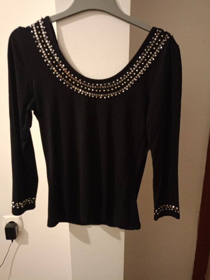 Siyah, uzun kollu, yuvarlak yaka ve payet işlemeli triko kumaştan yapılmış dar kesim bluz, trend günlük stil için uygundur. 40 bedene kadar uyumlu. esnek kumaş