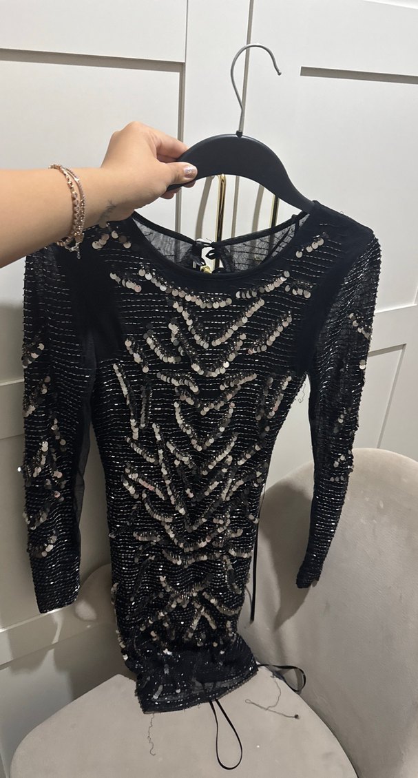 Siyah, uzun kollu, bisiklet yaka, payet ve nakış detaylı, fitted kesim midi elbisedir. Parlak ve şık bir gece kıyafetidir. ✨