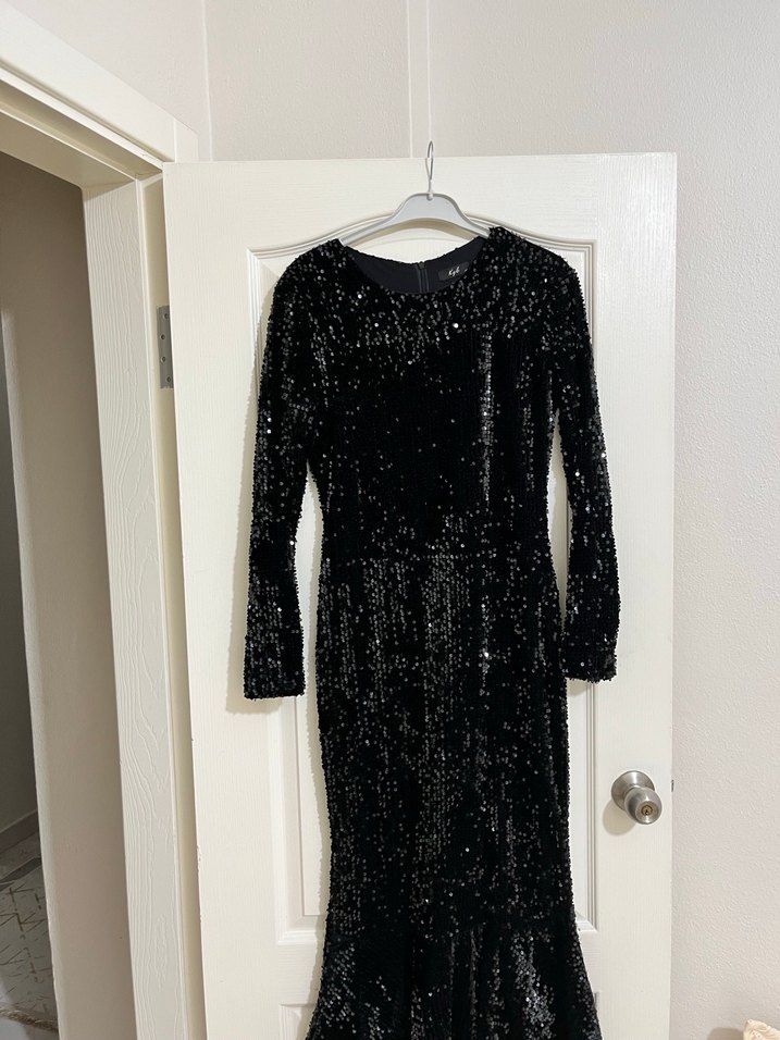 Bu siyah payetli uzun kollu abiye elbise, dar kesimi ve yuvarlak yaka detayıyla klasik ve göz alıcı bir görünüme sahiptir. Romantik akşamlar için uygundur.✨
