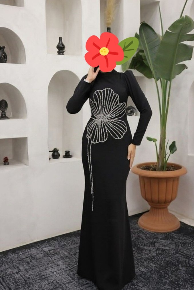 Siyah Payetli Uzun Kollu Uzun Elbise