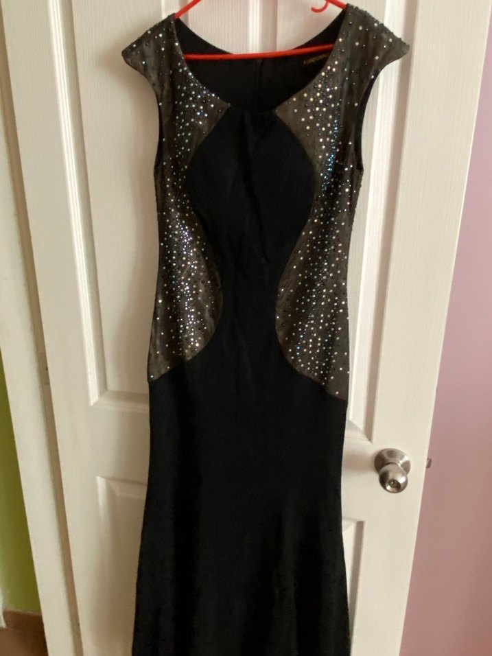 Siyah, v yaka ve kolsuz uzun abiye elbise, payetli parlak detaylarla süslenmiş. Parti için şık ve göz alıcı bir tercih. ✨