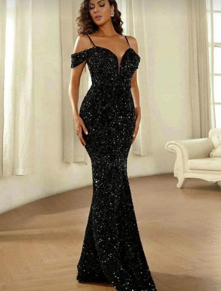 Bu siyah payetli elbise, derin V yakası ve ince askılarıyla dikkat çeker. Uzun ve vücuda oturan kesimiyle parti için uygundur. ✨bedenler mevcuttur