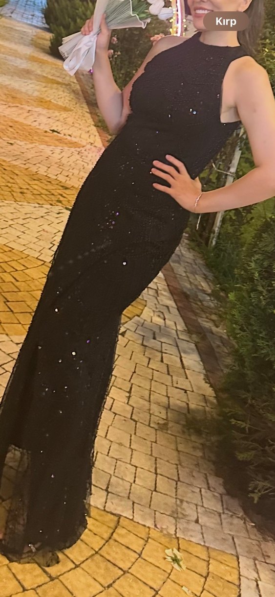 Siyah, payetli ve uzun kesimli abiye elbise, V yaka ve ince askılıdır. Yılan desenli kumaşıyla şık ve gotik bir tarz sunar. ✨ bir kere giydim alana hayırlı olsun etiket fiyatı 8 bin 36-38 uyumlu boyum 1.64