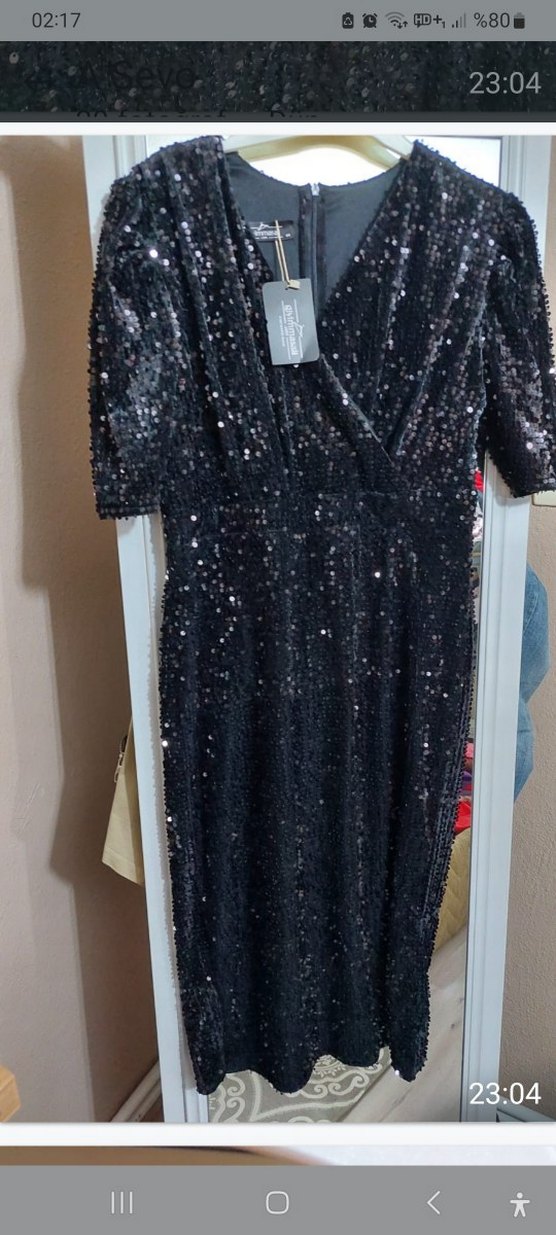 Siyah Payetli Uzun V Yaka Kadın Elbise
