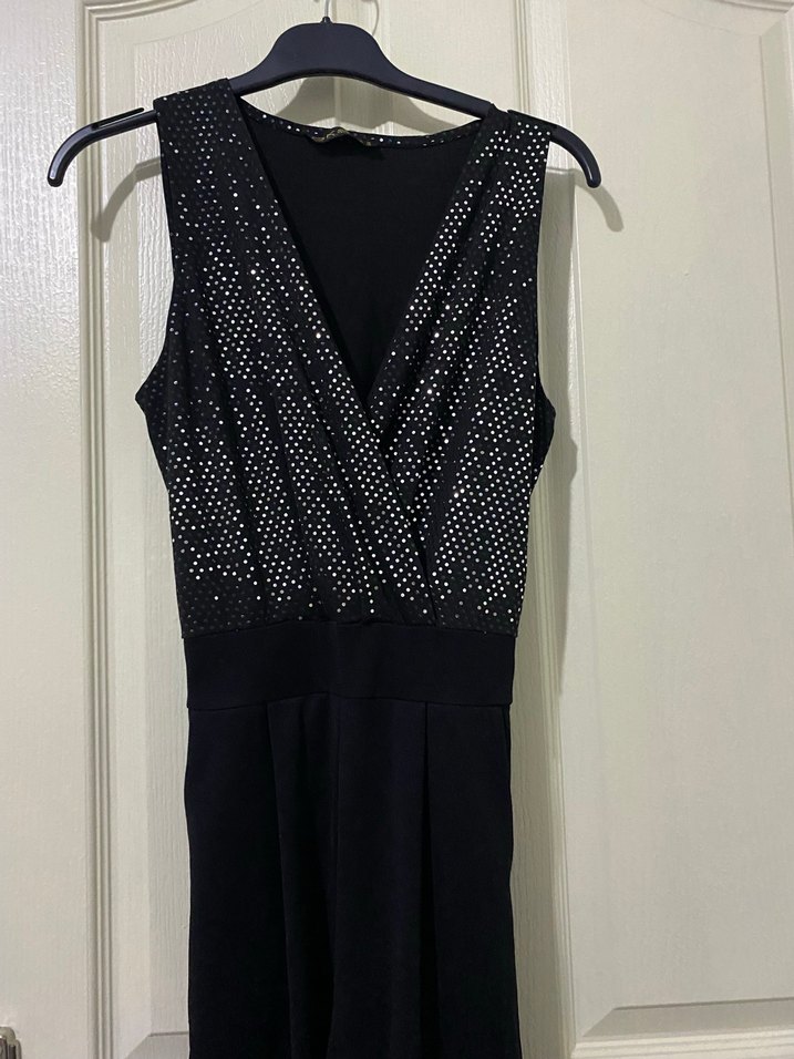 Siyah, uzun ve v yaka olan bu kadın tulum, payetli üst kısmı ve kolsuz tasarımıyla dikkat çeker.