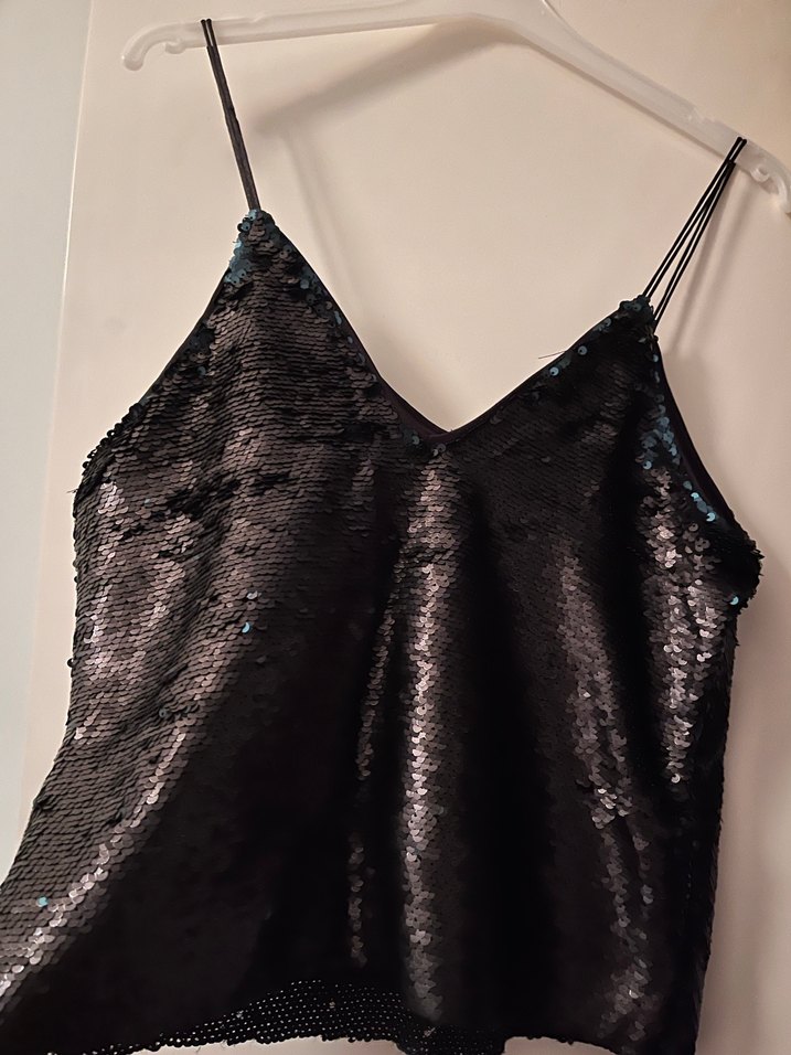 Siyah, payetli ve ince askılı bu v yaka bluz, parlak ve ipeksi dokusuyla dikkat çeker.