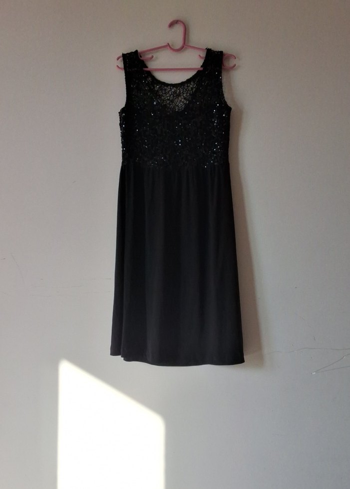 Siyah, kolsuz, V yakalı ve payetli detaylara sahip midi uzunlukta, Üstü vücuda oturan alt kısmı kiloş Kına Dügün için uygundur.