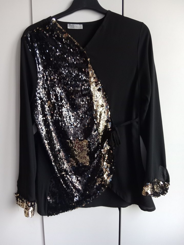 Siyah, uzun kollu, v yakalı, bol kesim kadın bluz. İpek gibi kumaş ve parlak payet detaylarıyla parti için uygun.