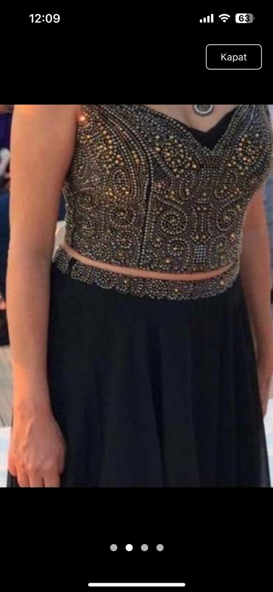 (Sadece bir kez giyildi) V yakalı, askılı, siyah midi abiye elbise, payetli ve işlemeli detaylarla göz alıcı goth tarzı sunar. ✨