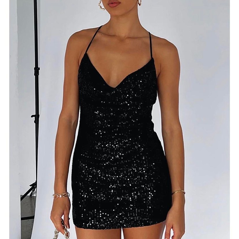Siyah payetlerle süslenmiş, V yakalı ve ince askılı, vücuda oturan mini elbise, partiler için ışıltılı ve iddialı bir tarz sunar. ✨