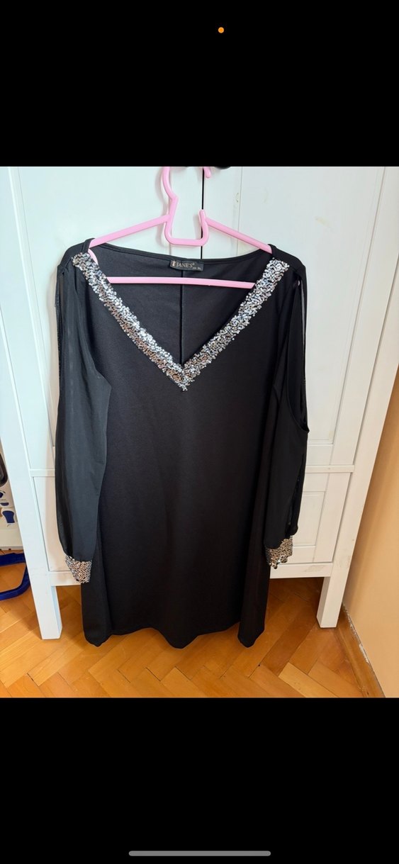 Siyah, uzun kollu, V yakalı, bol kesim gece elbisesi. Yakası ve manşetleri payetlerle süslenmiştir. Romantik akşamlar için uygun. ✨