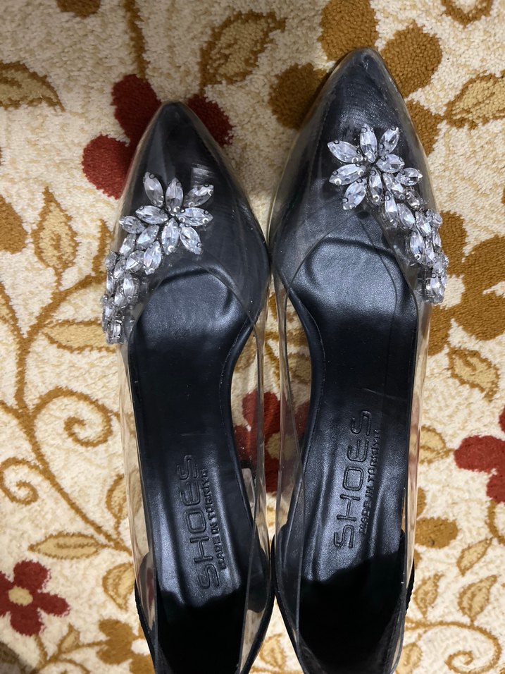 Siyah renkli, payetli çiçek desenli, kauçuk malzemeden yapılmış yüksek topuklu kadın abiye ayakkabı, düğün için uygundur. Sadece iki kere evin içinde giyildi