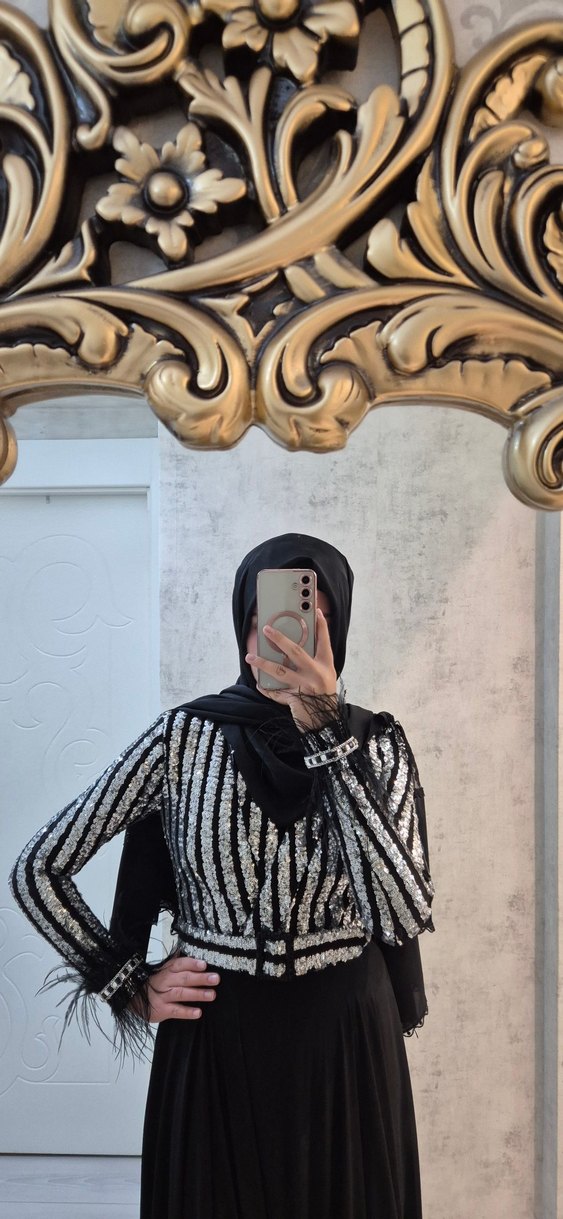 Siyah ve gri zebra desenli payetlerle süslenmiş, uzun kollu ve yüksek yakalı, dar kesim uzun elbise. etek kısmı sifondur