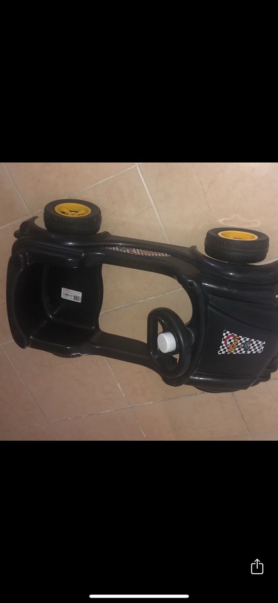 Siyah gövde ve sarı tekerleklere sahip çocuk arabası, çocuklar için el kol ve ayak koordinasyonu için kullanıma uygundur sadece tekerleğin biri çıkıyor