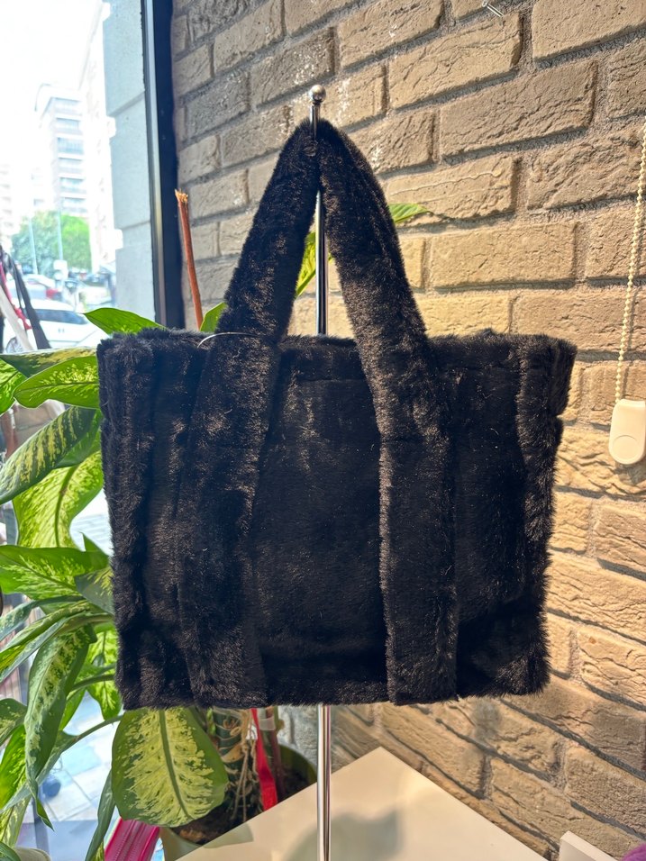 Siyah, peluş detaylı ve yumuşak sentetik kumaştan üretilmiş, sokak stili ve günlük kullanıma uygun kadın çantası.