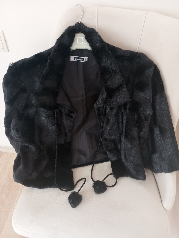 Peluş detaylı, siyah mini ceket; kısa boy, notched lapel yakalı ve bol kesimdir. Rahat fleece kumaştan, goth tarzıyla ofis için uygundur. Abiye üstüne kullanılabilecek bilerek, mini ceket