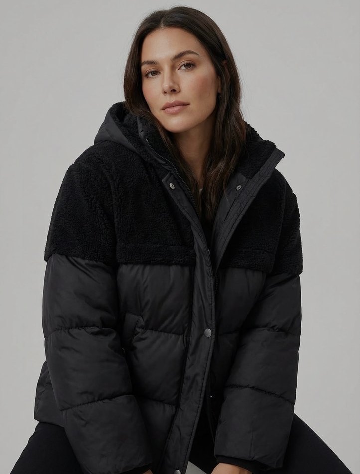 Siyah Peluş Detaylı Şişme Mont