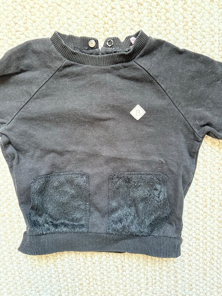Siyah , uzun kollu ve bisiklet yaka erkek çocuk sweatshirtü. Ön cep kısmında peluş detaylar bulunur. Yumuşak ve rahat peluş kumaştan, bol kesim.