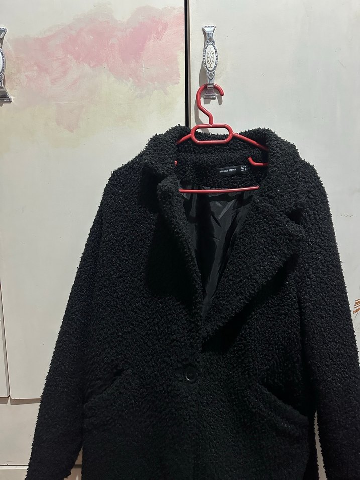 Yumuşak dokulu siyah kumaştan, klasik yakalı ve iki cep detaylı, sıcak tutan kaban.