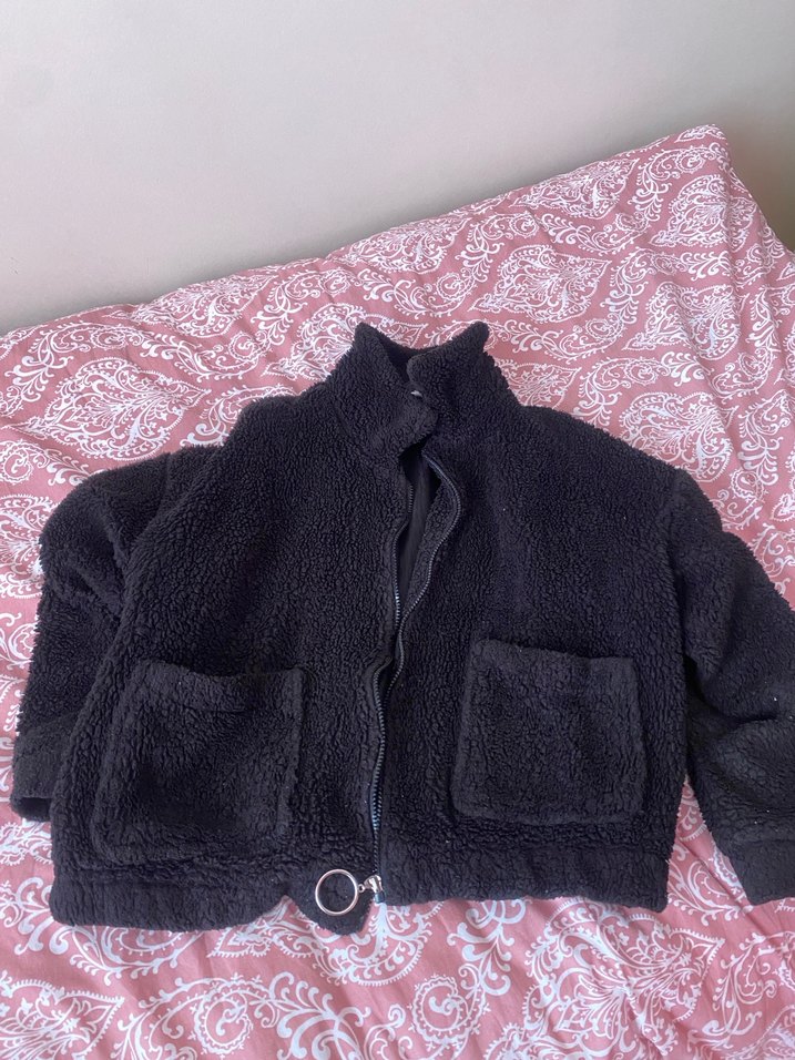 Siyah peluş kumaştan yapılmış, yüksek yakalı ve uzun kollu, bol kesim kadın ceket. Önünde iki cep ve fermuar detayları bulunur.