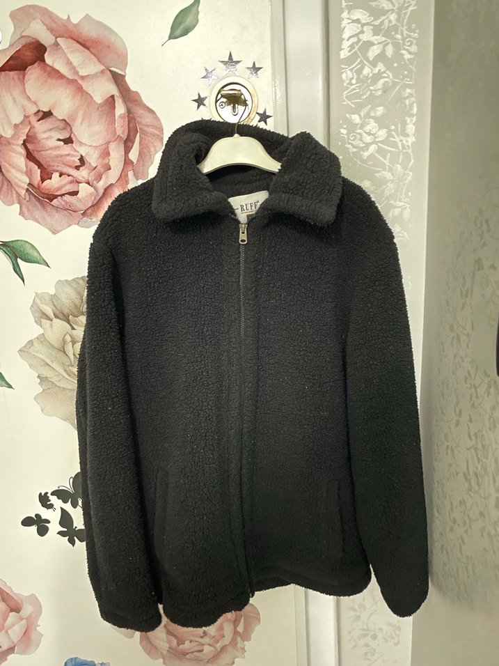 Siyah peluş kumaştan, yüksek yakalı ve fermuarlı uzun kollu kadın ceket. Rahat ve bol kesim, günlük sokak stiline uygun.