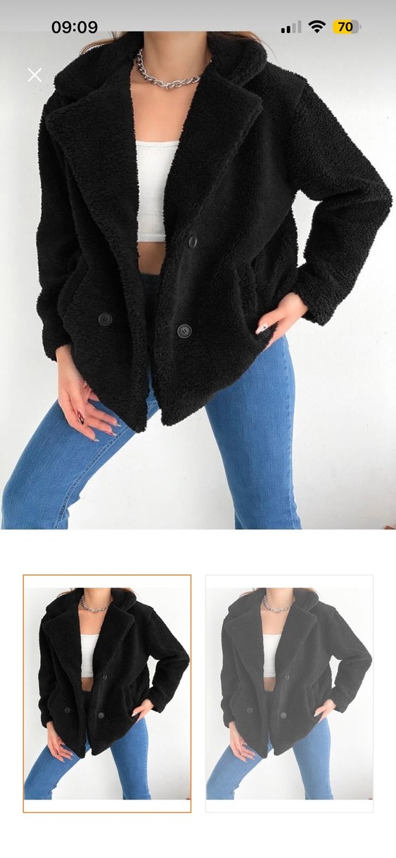 Siyah peluş kumaştan, kürklü detaylı, notalı yaka, uzun kollu ve salaş kesime sahip kadın ceketi. Midi boy, günlük kullanım için uygundur.