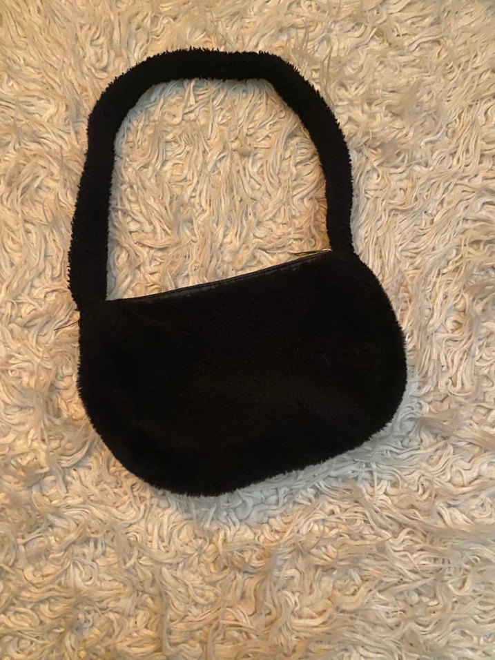 Siyah, yumuşak ve sıcak peluş kumaştan yapılmış, kürk detaylı, sade ve desen olmayan günlük kullanıma uygun kadın çantası .